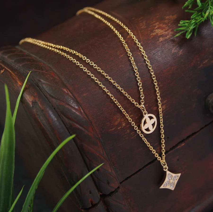 Navigate your style with confidence and grace in the Celestial Compass dual Layered Necklace—a striking fusion of modern geometry and symbolic charm. This elegant dual-layered gold-tone necklace features two unique pendants: a circular compass-inspired charm on the shorter chain and a star-like diamond-accented charm on the lower layer. Together, they evoke a sense of direction, wonder, and cosmic energy.