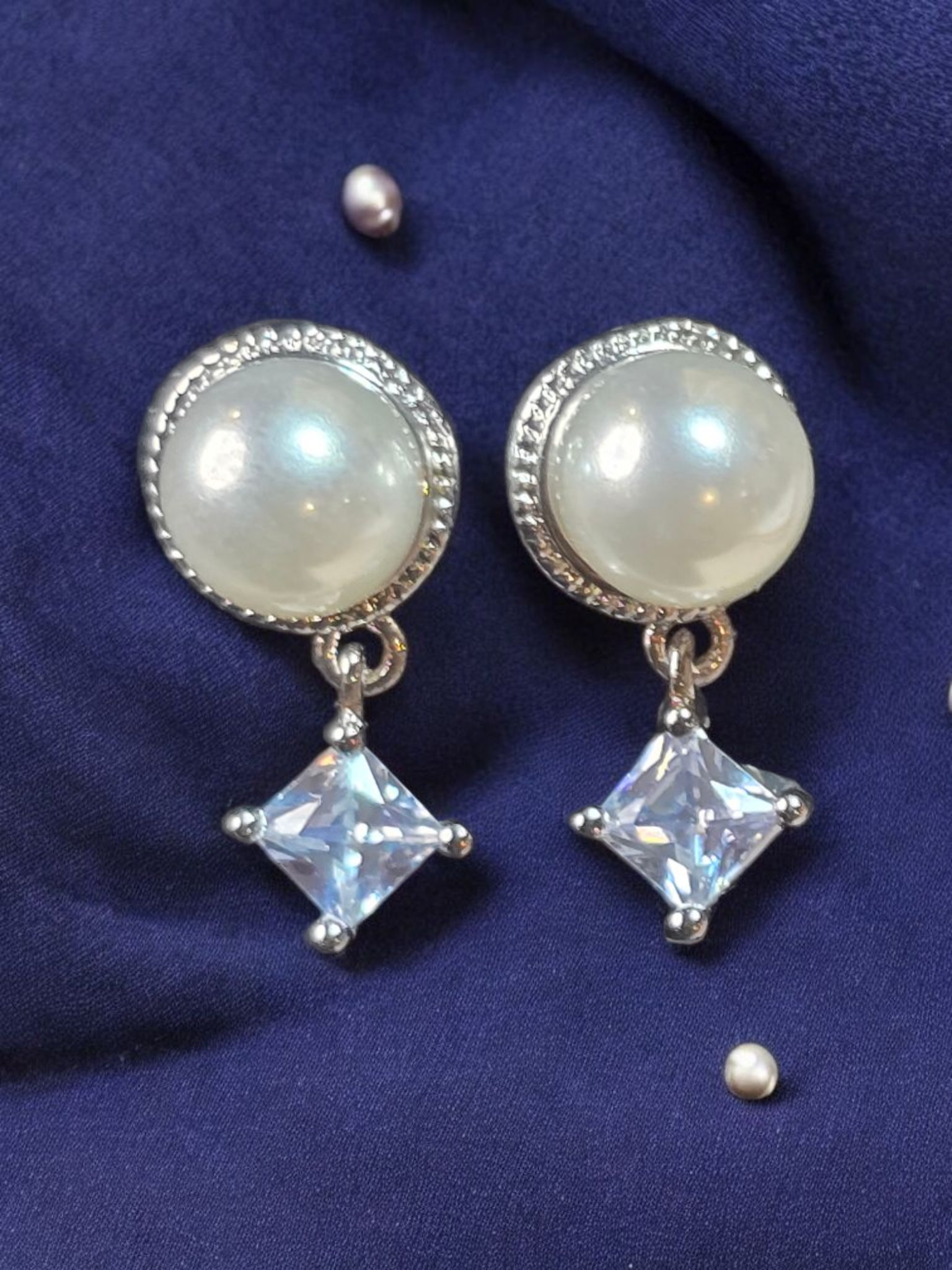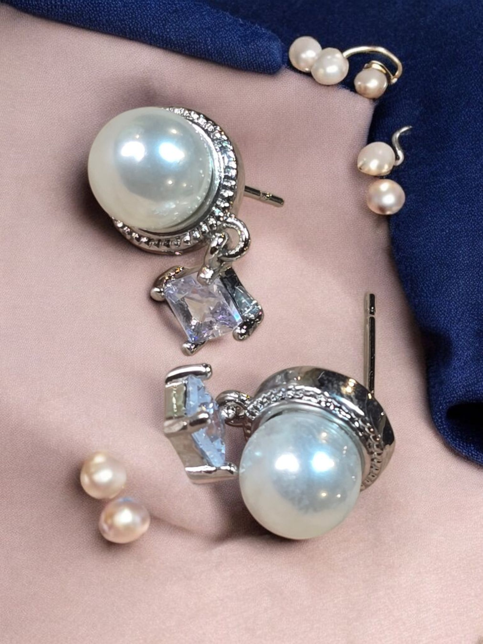 - Design: Pearl stud with dangling diamond-cut square crystal