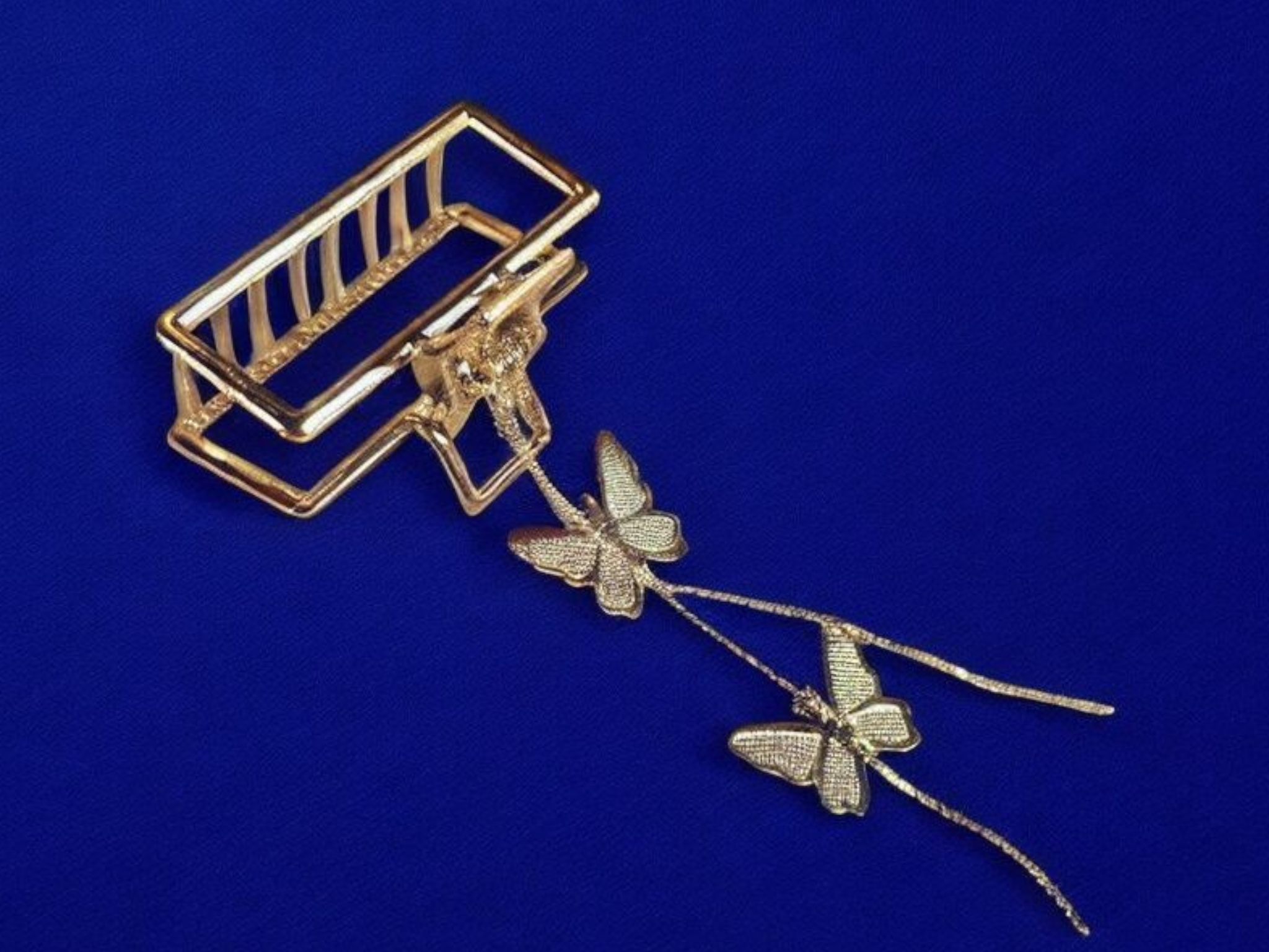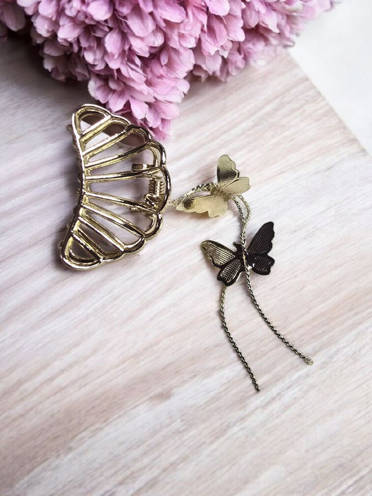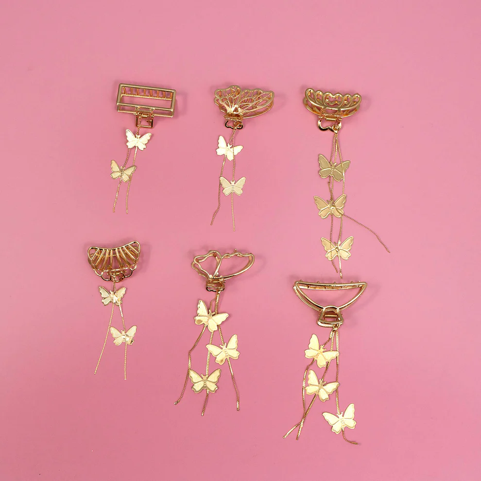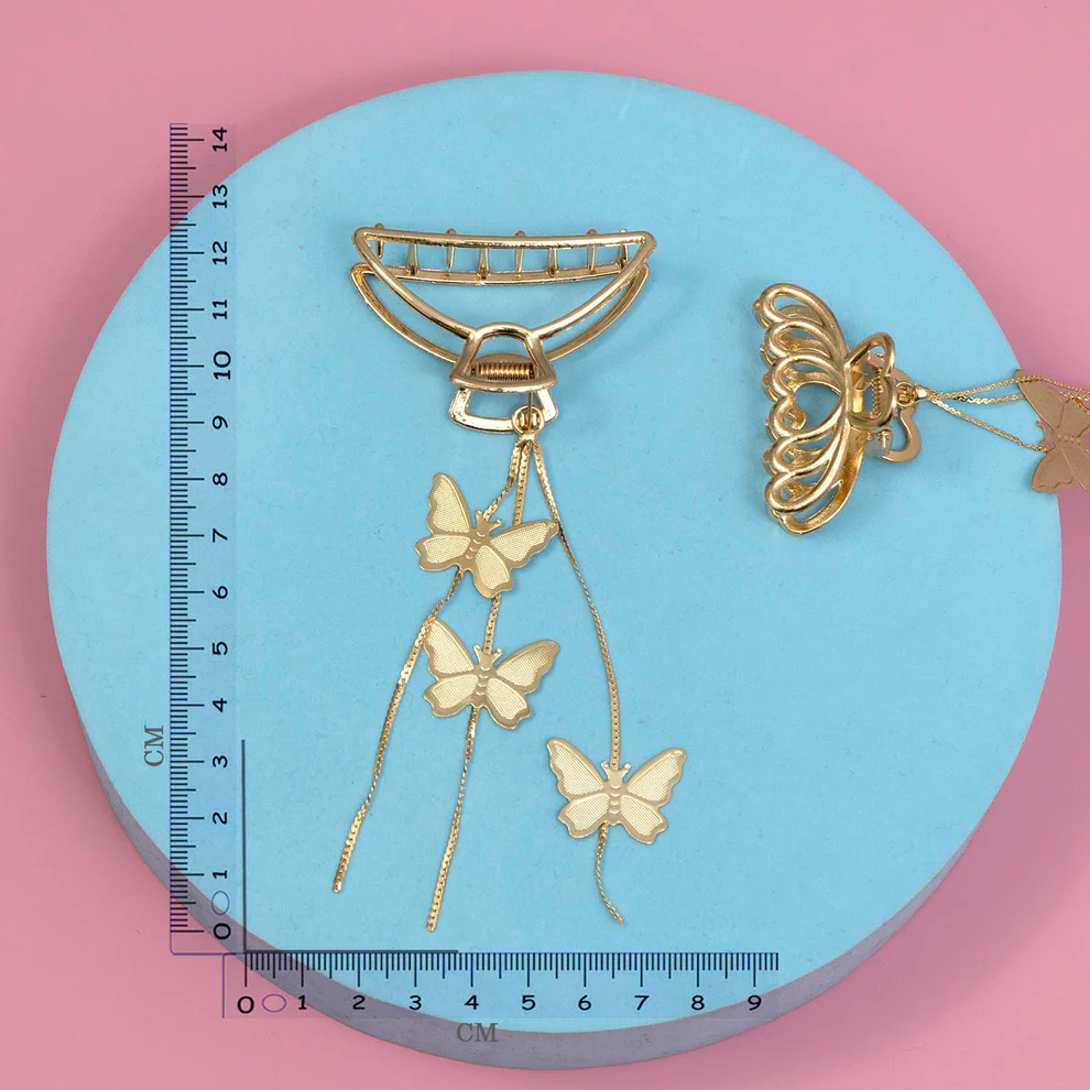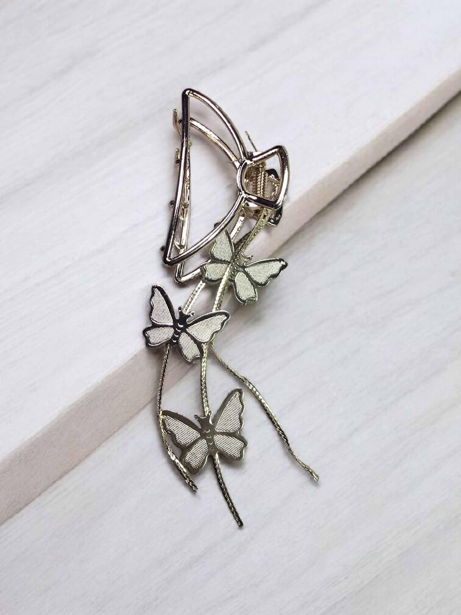 Elevate your hairstyle with the Golden Ethereal Butterfly Cascade Hair Claw, a graceful accessory that captures the delicate beauty of fluttering butterflies. Crafted from polished gold-tone metal, this elegant claw clip features intricate openwork butterfly shapes with charming dangling accents that add movement and sparkle to every look.