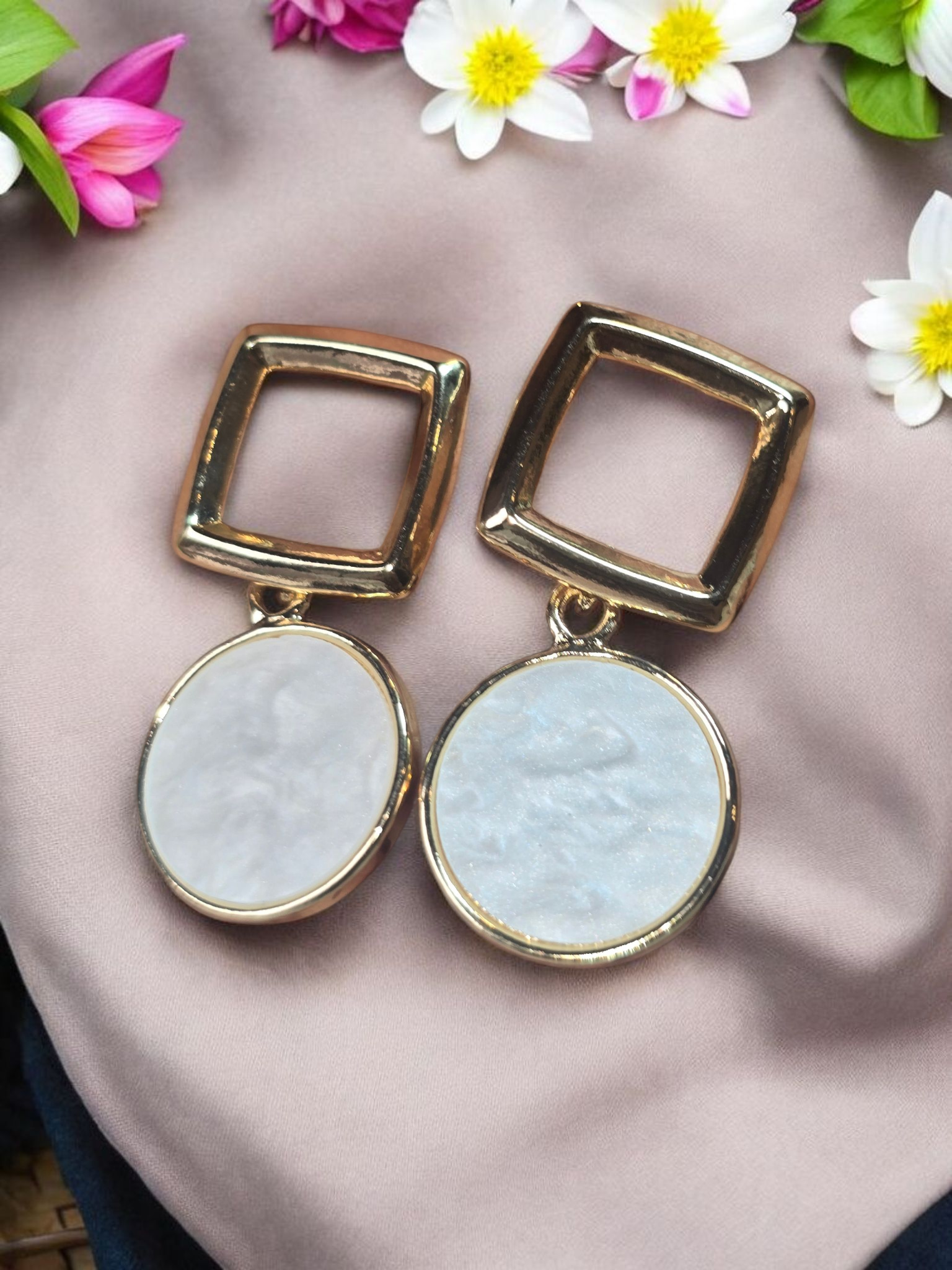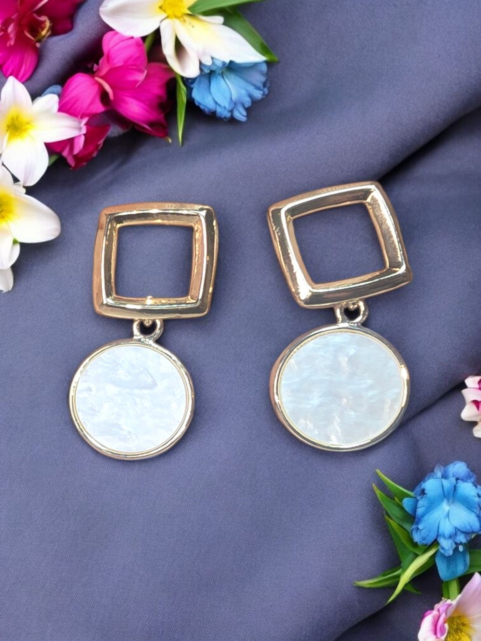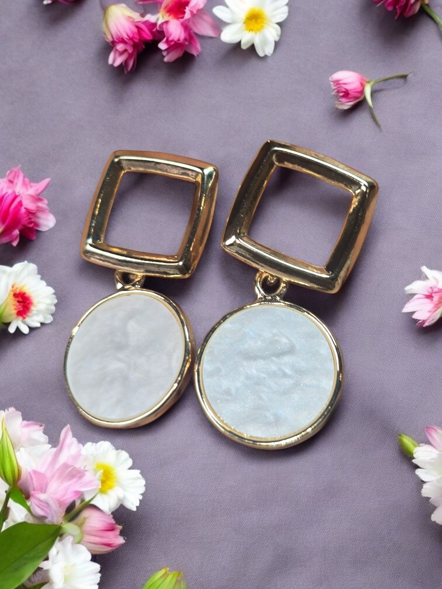 - Design: Open square stud with a large circular pearlescent drop for a geometric-chic silhouette