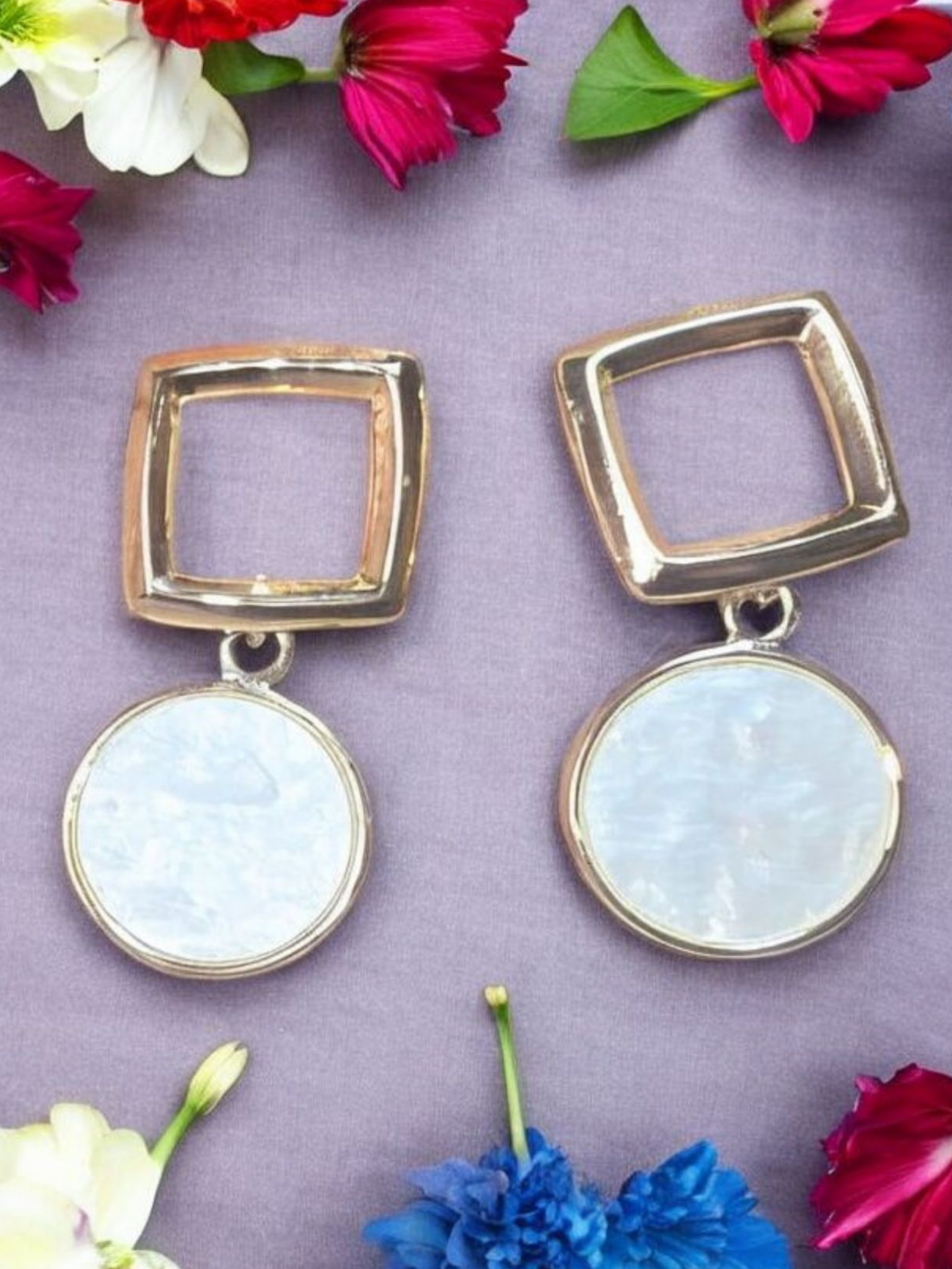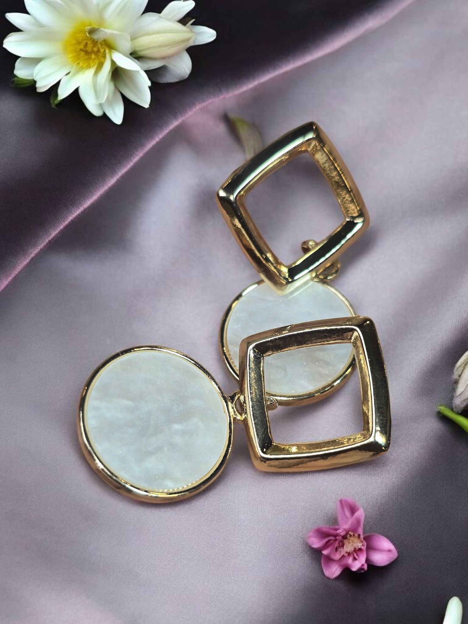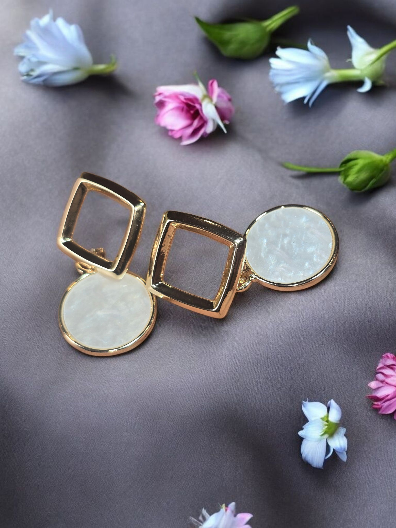 - Design: Open square stud with a large circular pearlescent drop for a geometric-chic silhouette