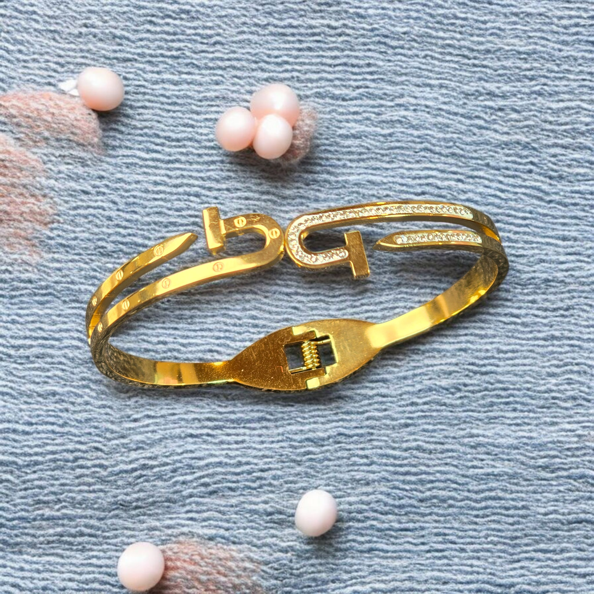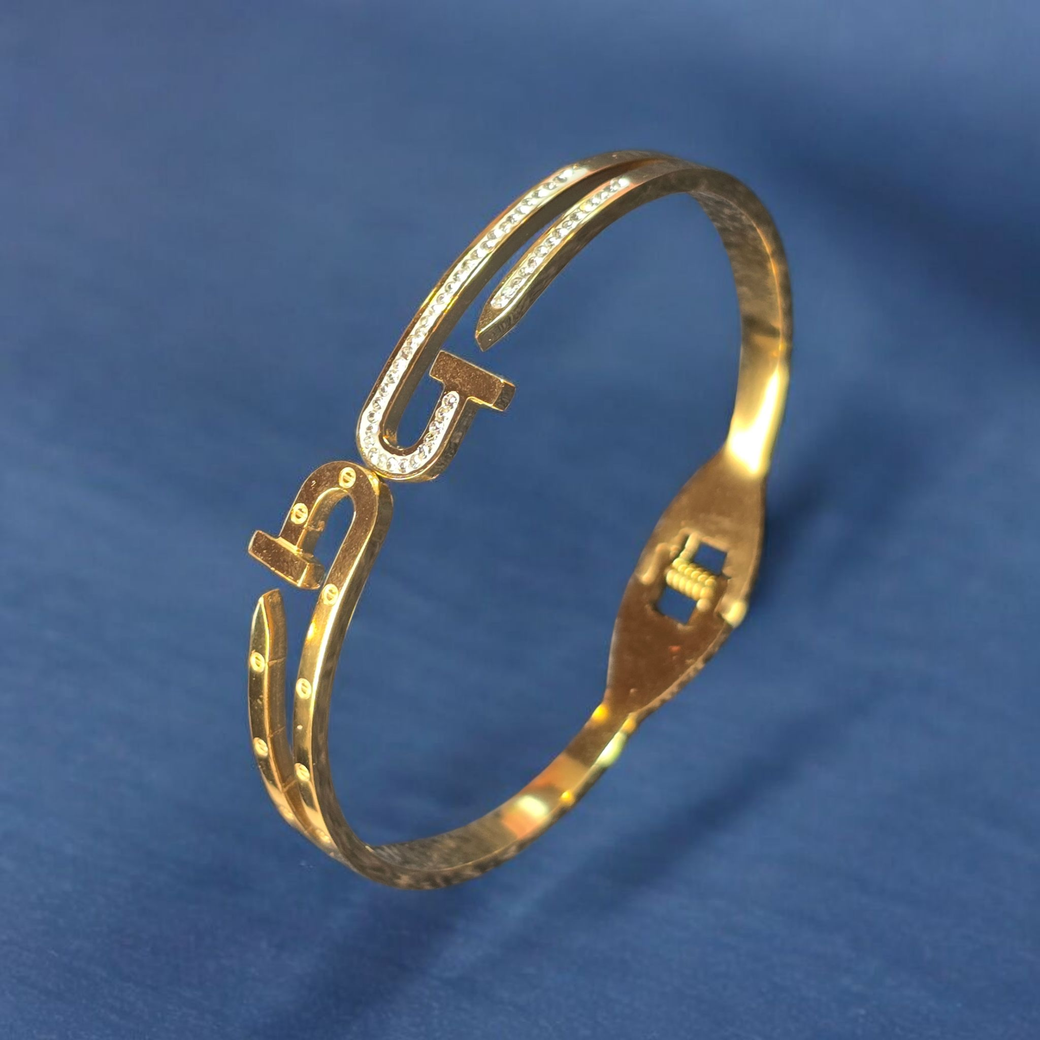 Make a bold statement with the Golden Torque Crystal Buckle Bracelet — a striking blend of modern design and luxurious sparkle. Featuring a unique double-band torque silhouette with a stylized buckle centrepiece embellished with shimmering crystal pavé, this bracelet captures both edge and elegance. Crafted in gleaming gold-tone metal, the open-ended design offers a comfortable fit with an adjustable clasp mechanism for ease of wear. The sparkling crystals add a refined brilliance, elevating the piece to a sophisticated accessory perfect for day-to-night styling.