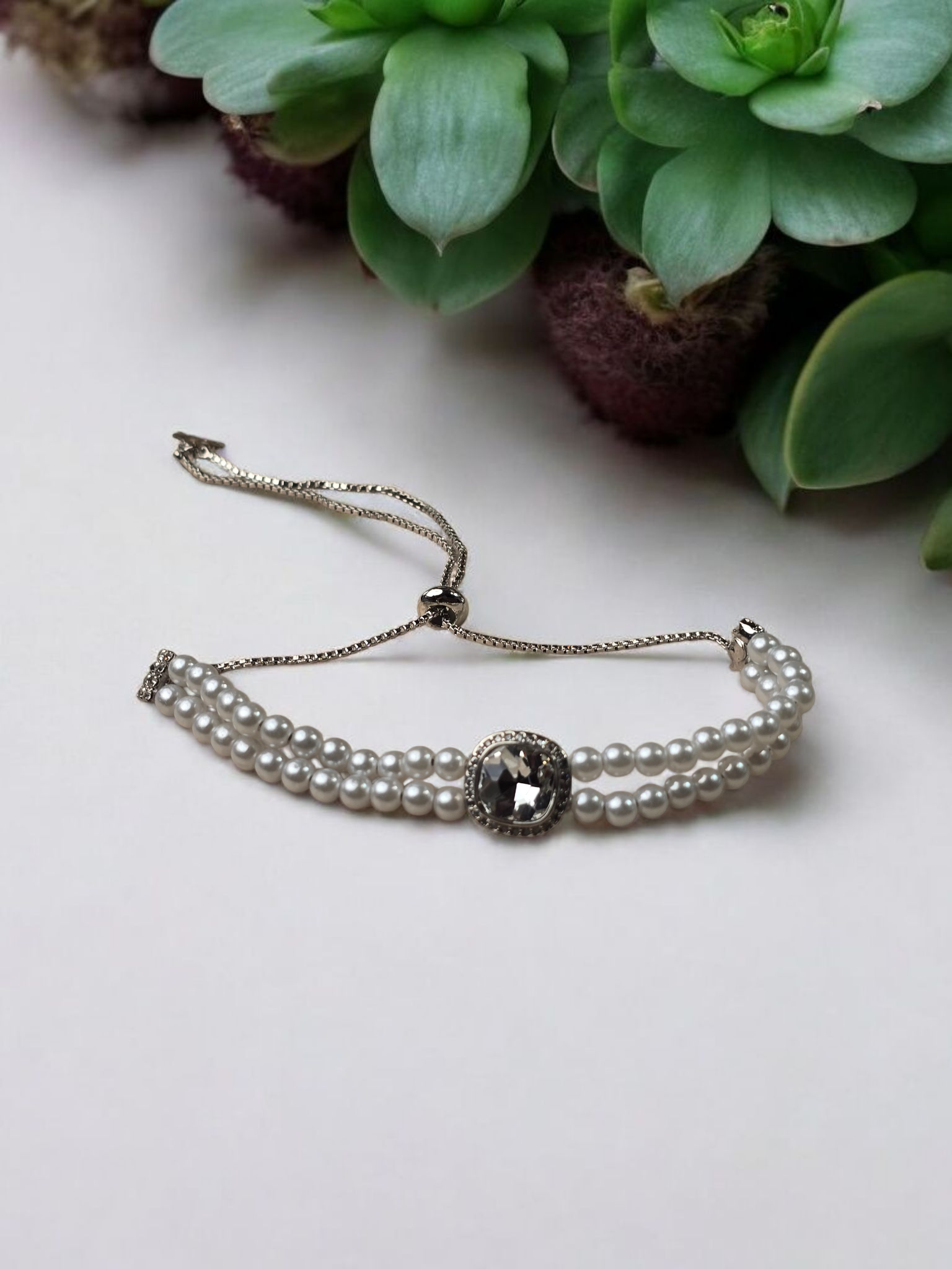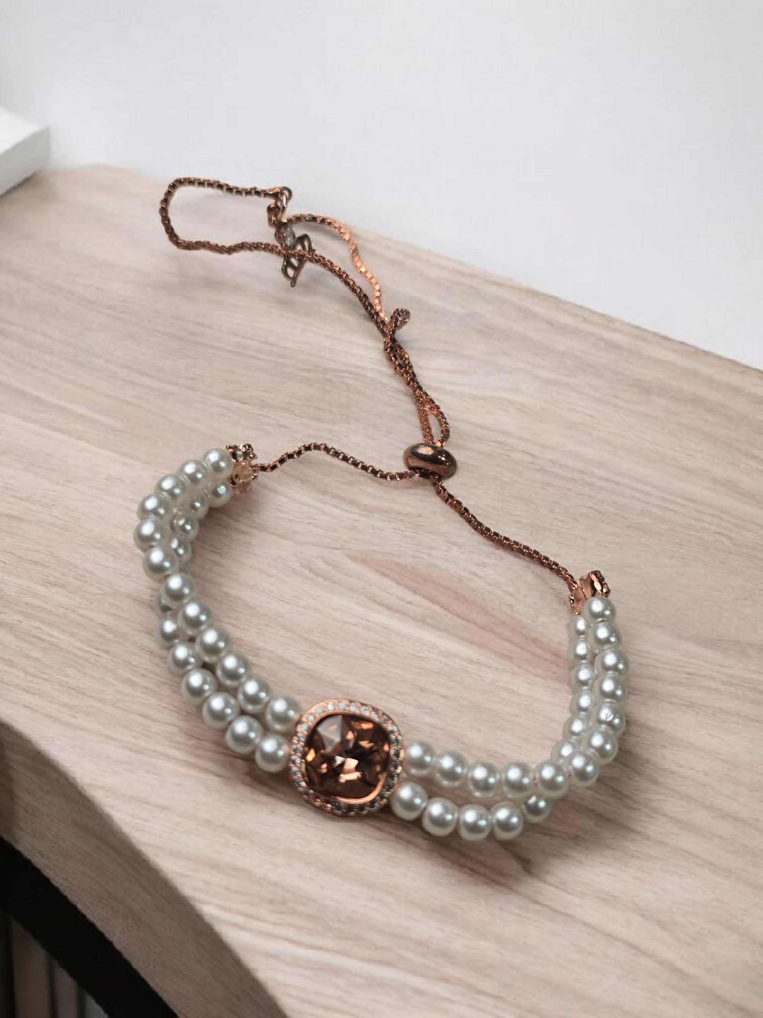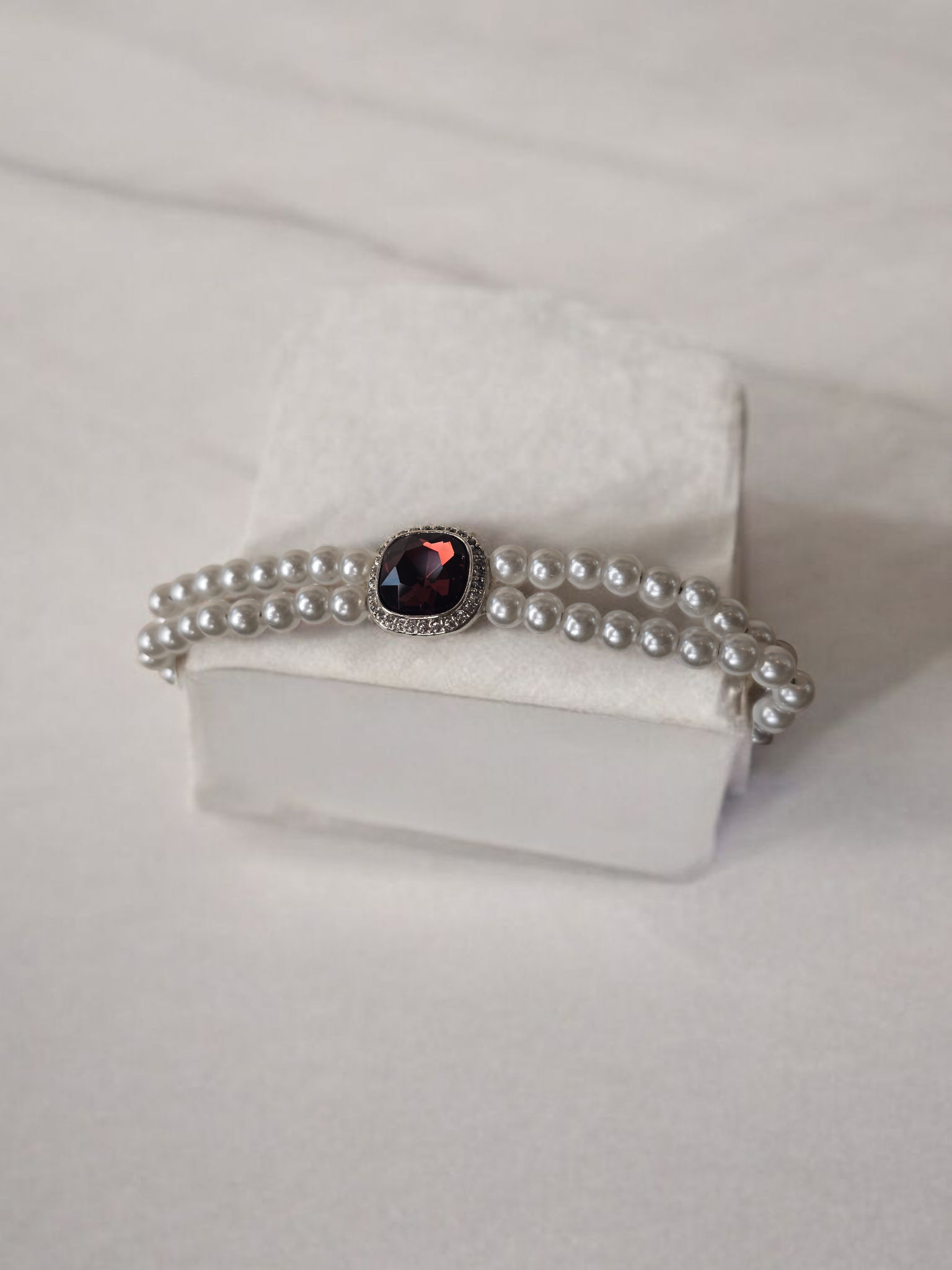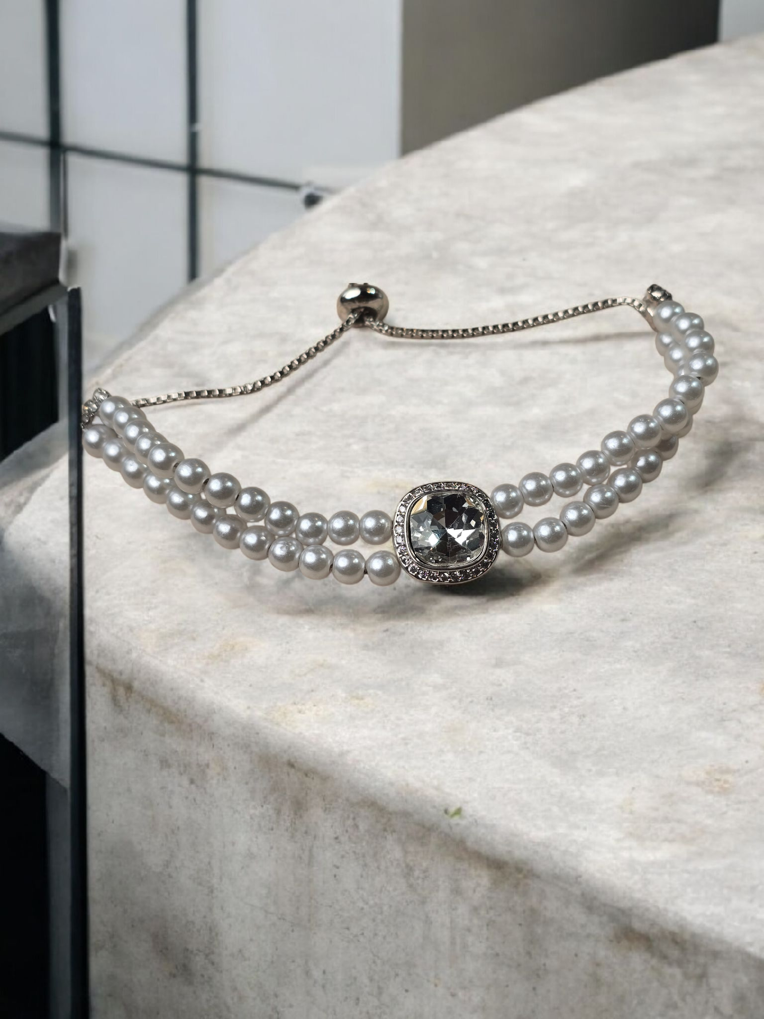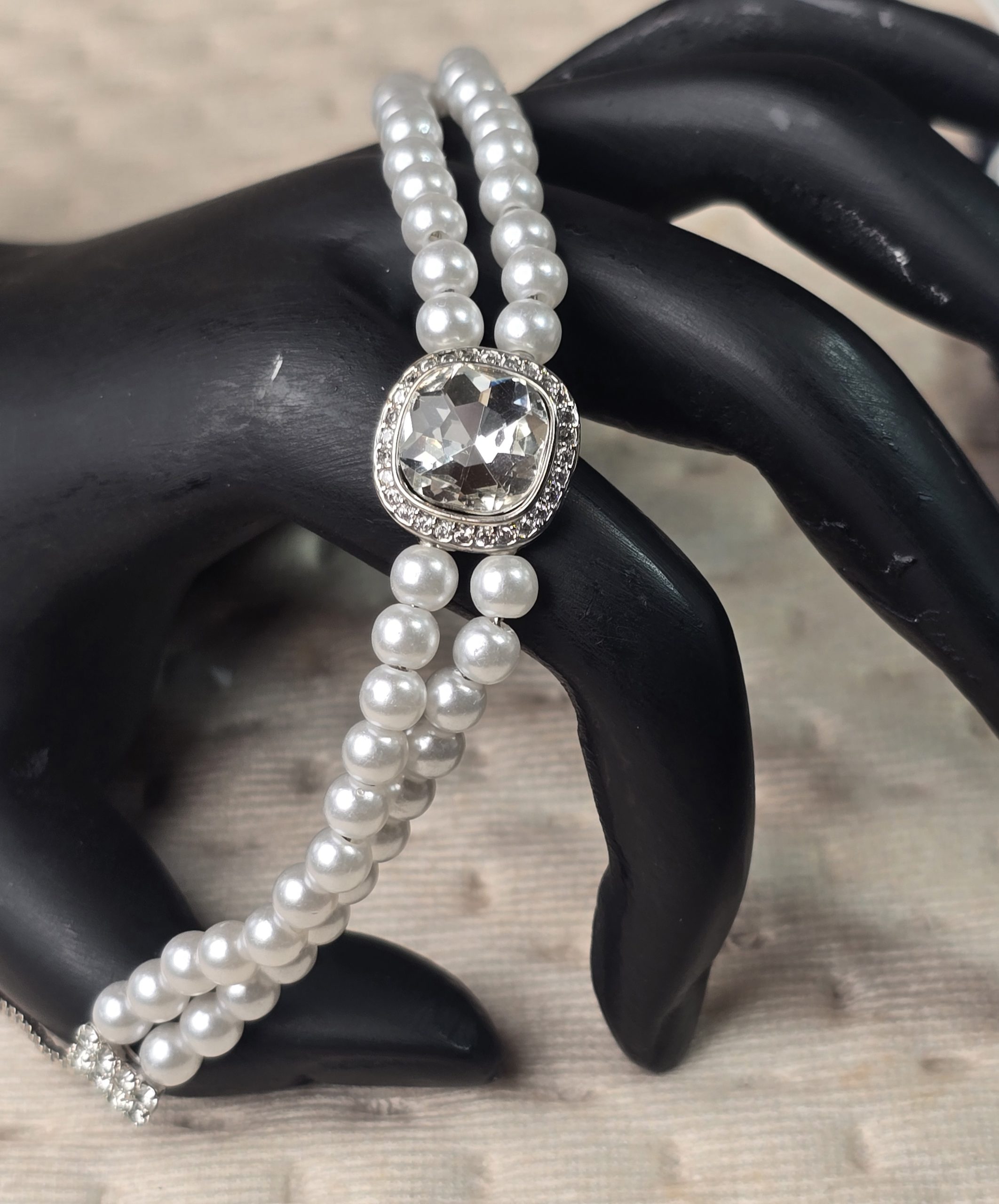- Design: Dual-strand faux pearl bracelet with a central black crystal and rhinestone halo