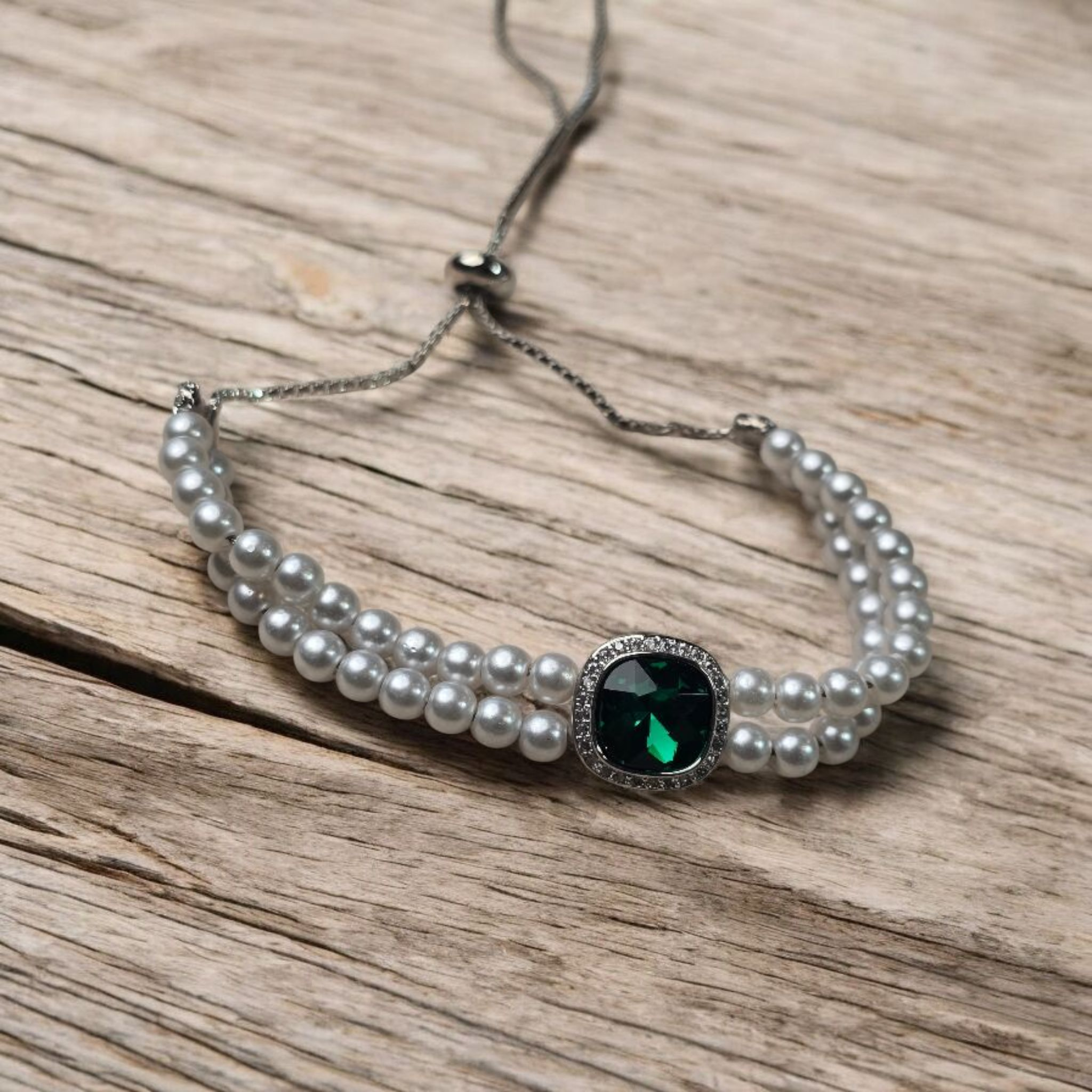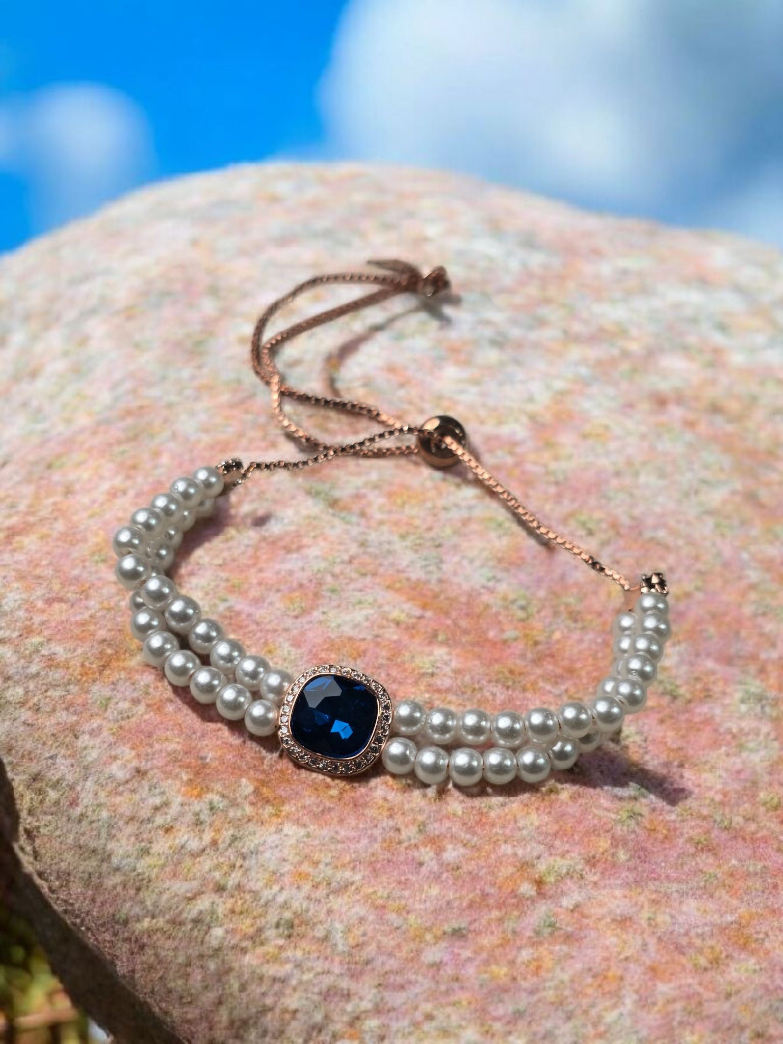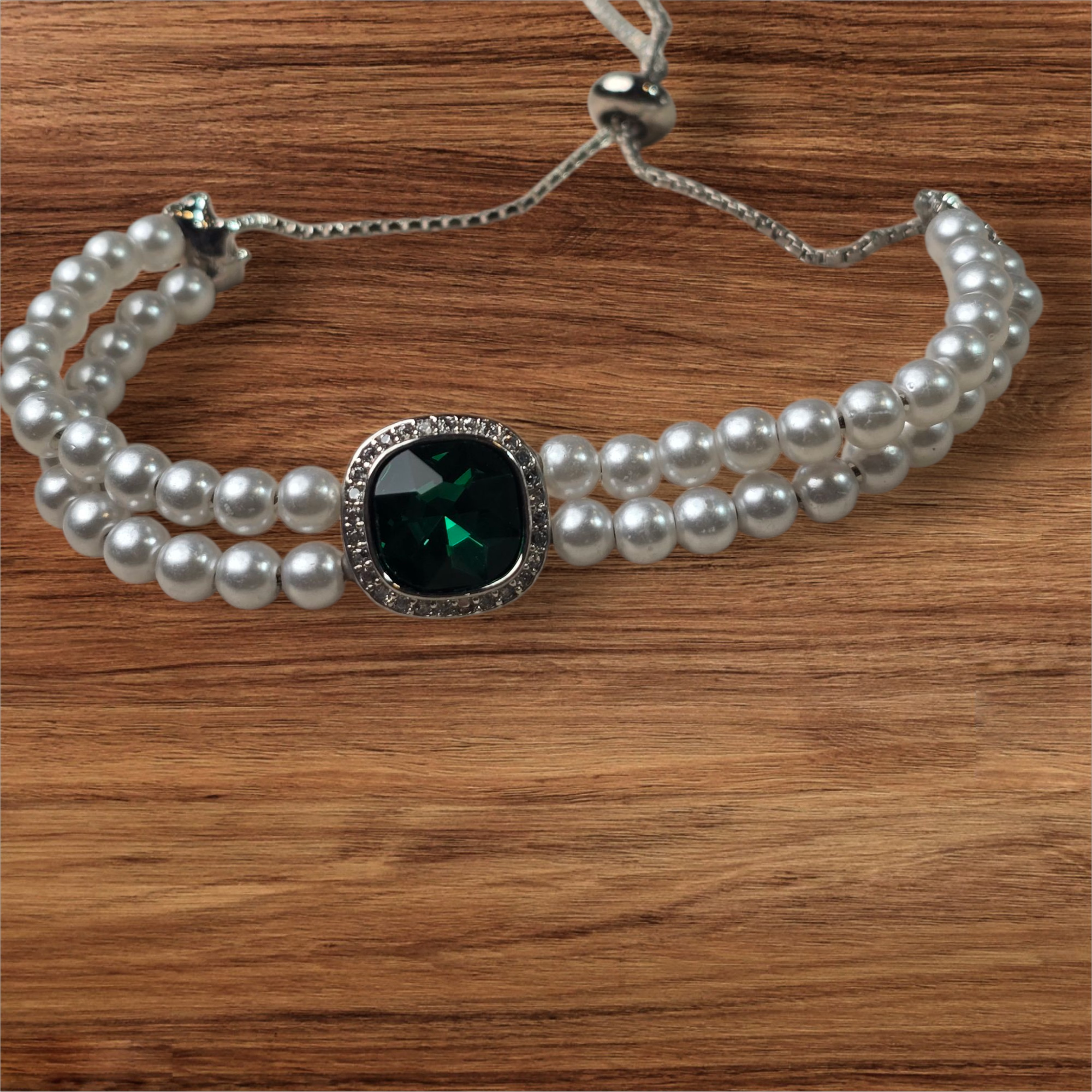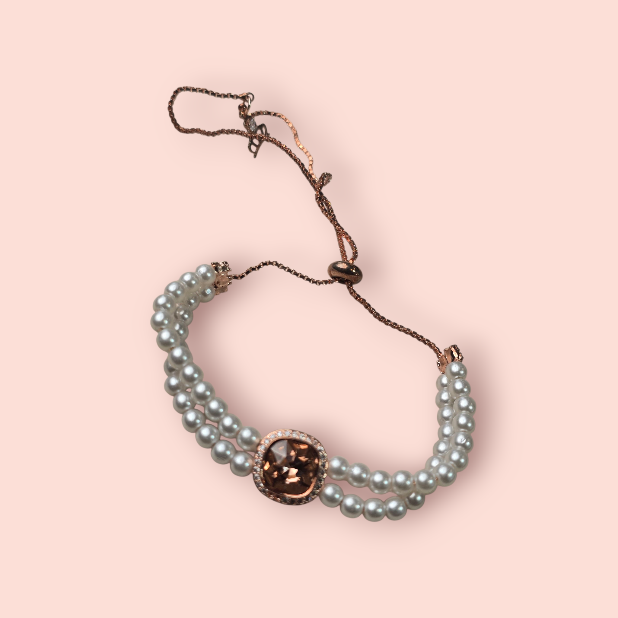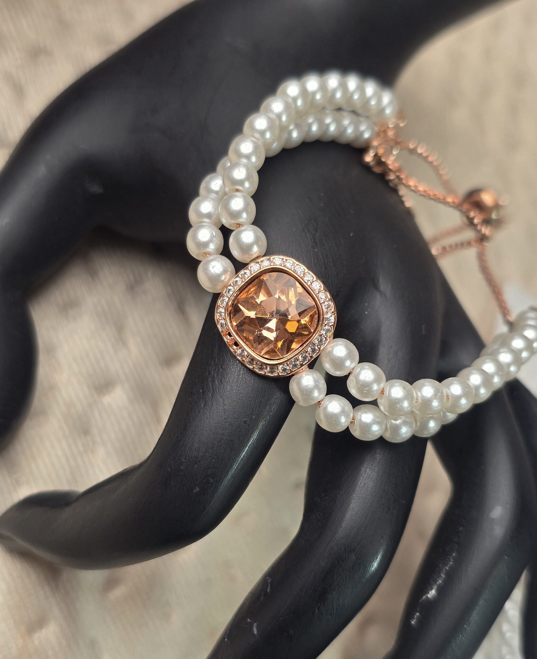 - Design: Dual-strand faux pearl bracelet with a central black crystal and rhinestone halo