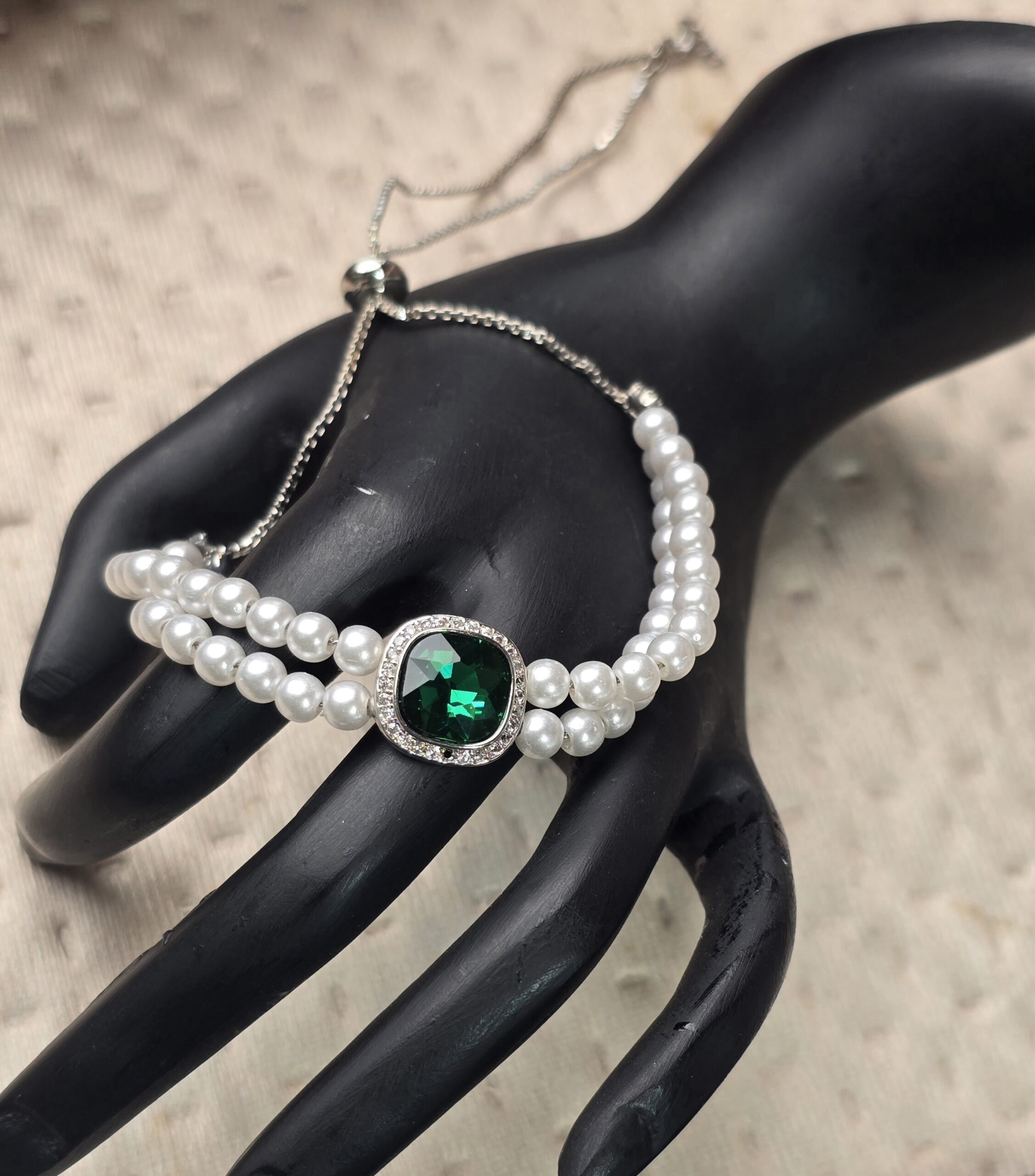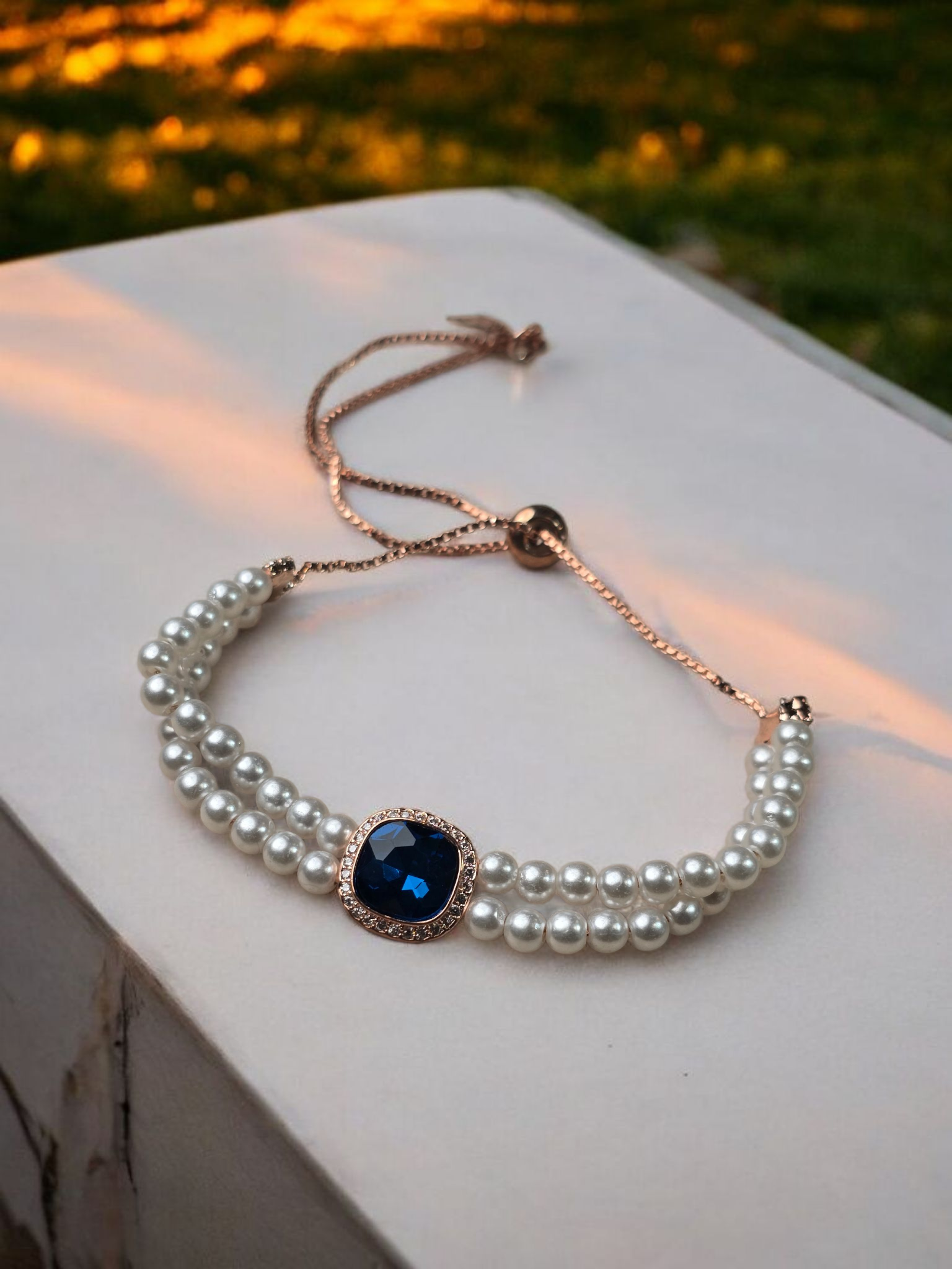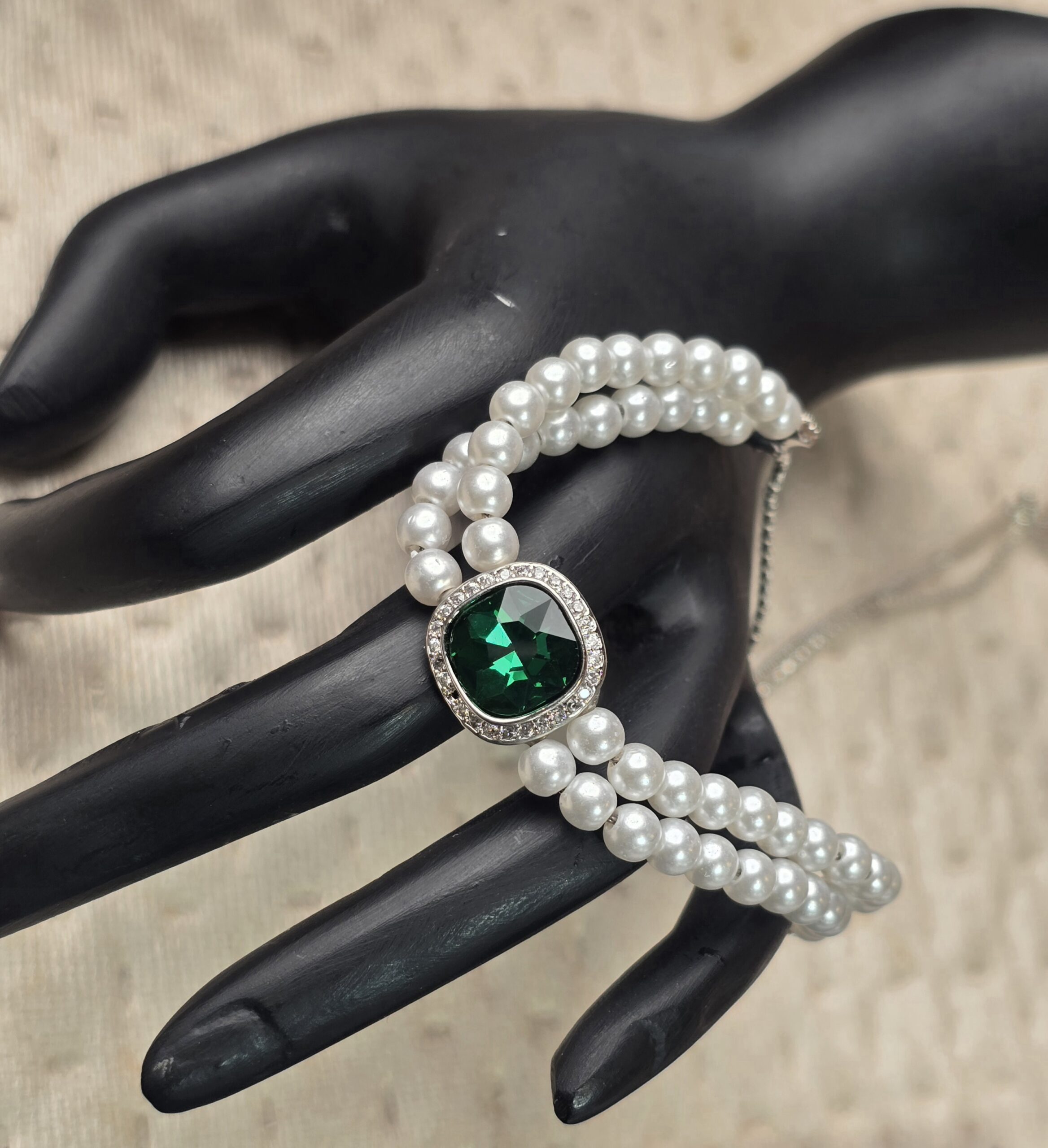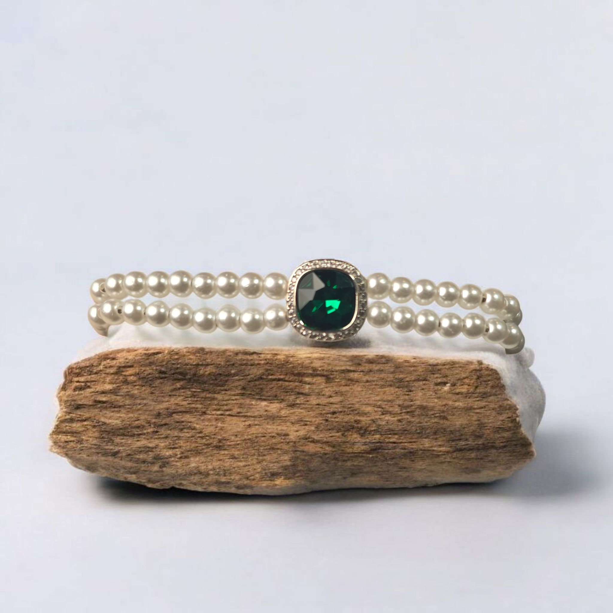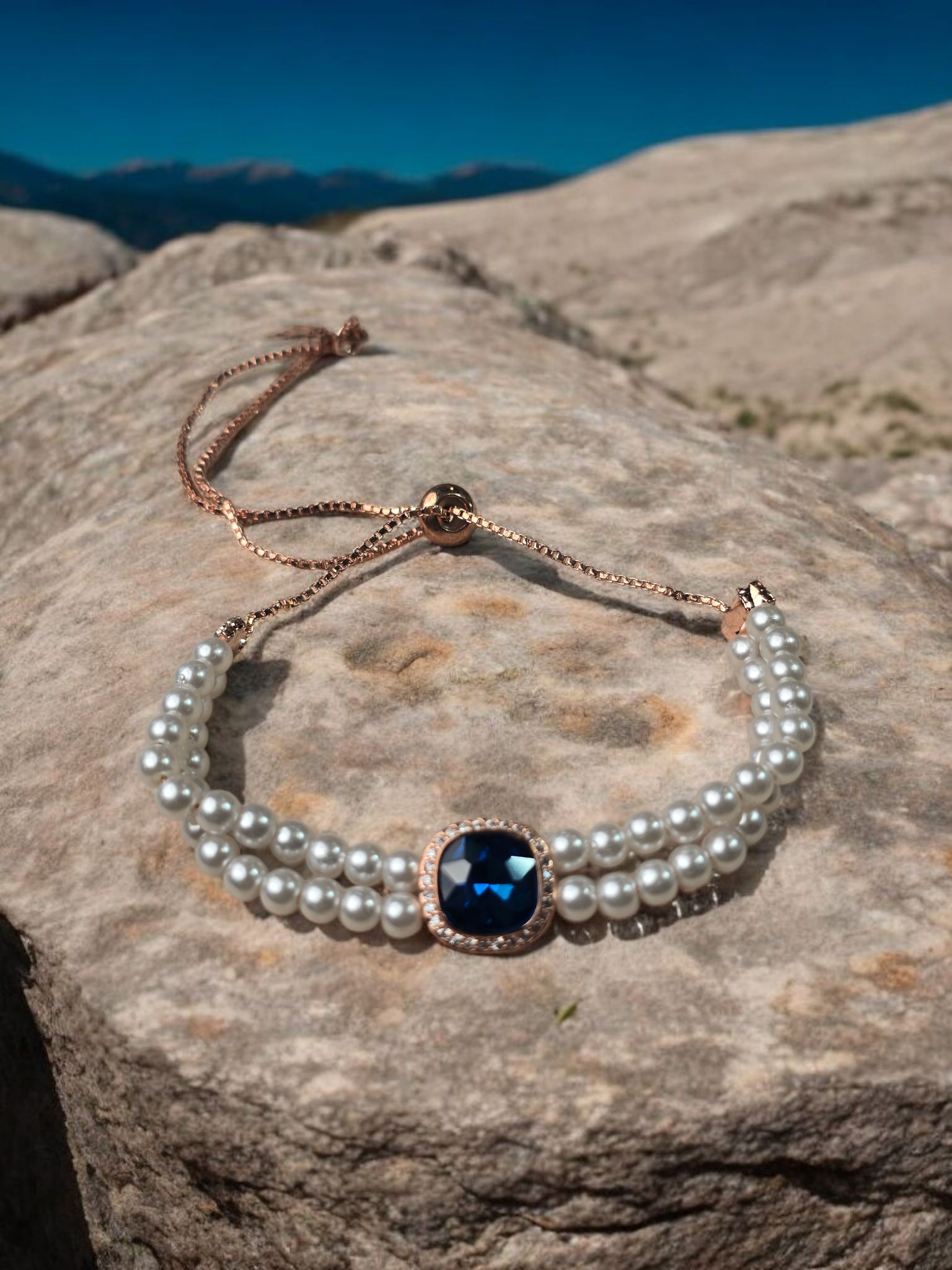 - Design: Dual-strand faux pearl bracelet with a central black crystal and rhinestone halo