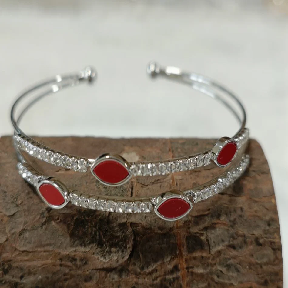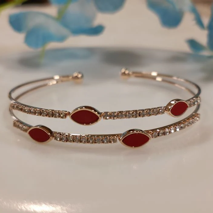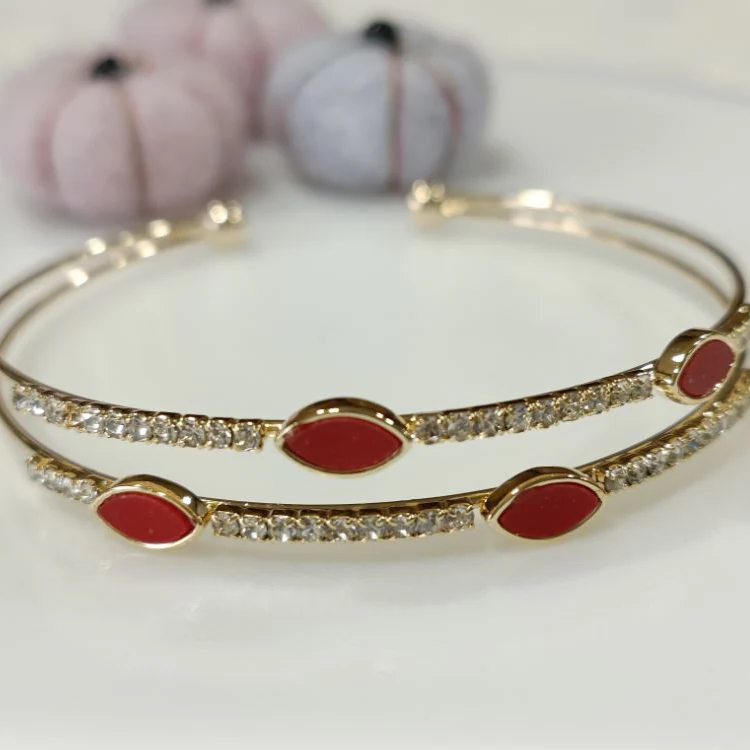This open cuff design features dual bands adorned with shimmering crystals that catch the light beautifully, while the vibrant red petal motifs add a passionate pop of color and modern flair. Crafted for effortless style, it’s perfect for adding a statement touch to both casual and evening looks.